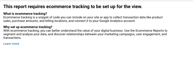 Under ‘Conversions,’ click on ‘Ecommerce,’ then ‘Overview.’ When the prompt appears, click ‘Learn more.’